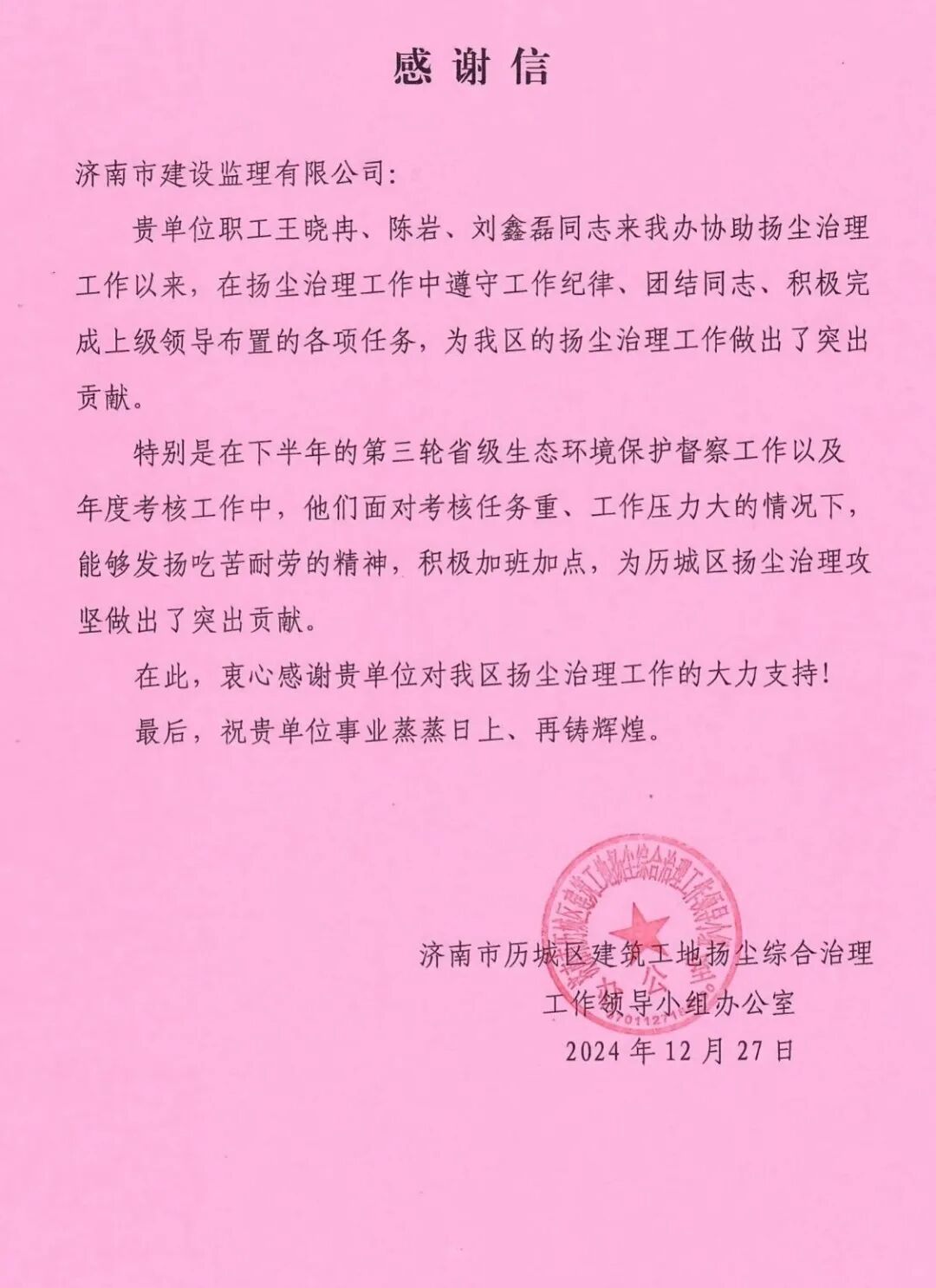 近日,我公司歷城區(qū)住建局第三方巡檢項(xiàng)目收到了來自歷城區(qū)建筑工地?fù)P塵綜合治理工作領(lǐng)導(dǎo)小組辦公室表揚(yáng)信,信中對我公司項(xiàng)目工作人員的業(yè)務(wù)水平、責(zé)任心、組織協(xié)調(diào)能力給予充分肯定。