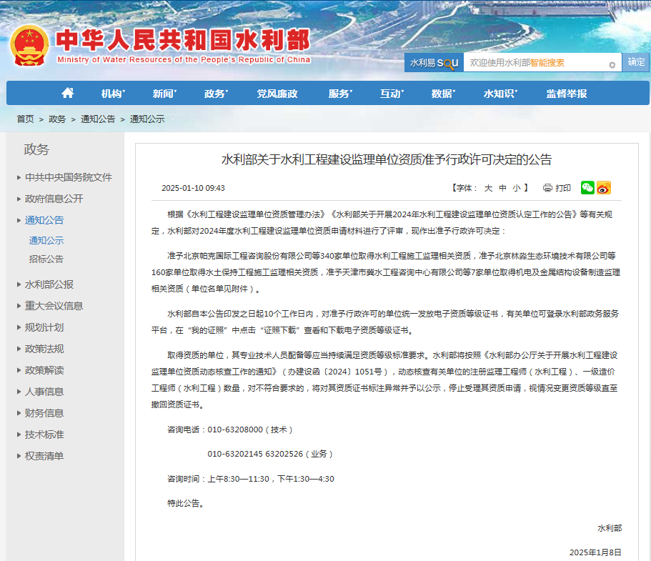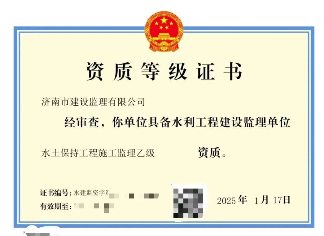 二〇二五年一月,經(jīng)水利部批準,我公司同時取得水利工程施工監(jiān)理乙級資質(zhì)及水土保持工程施工監(jiān)理乙級資質(zhì)。這是我公司在取得工程監(jiān)理綜合資質(zhì)后,又獲得的住建部管理范疇之外的從業(yè)資格,為公司經(jīng)營業(yè)務(wù)開辟新的領(lǐng)域,為公司業(yè)務(wù)類型的拓展提供新的平臺,也為公司持續(xù)、快速發(fā)展奠定了堅實基礎(chǔ)。