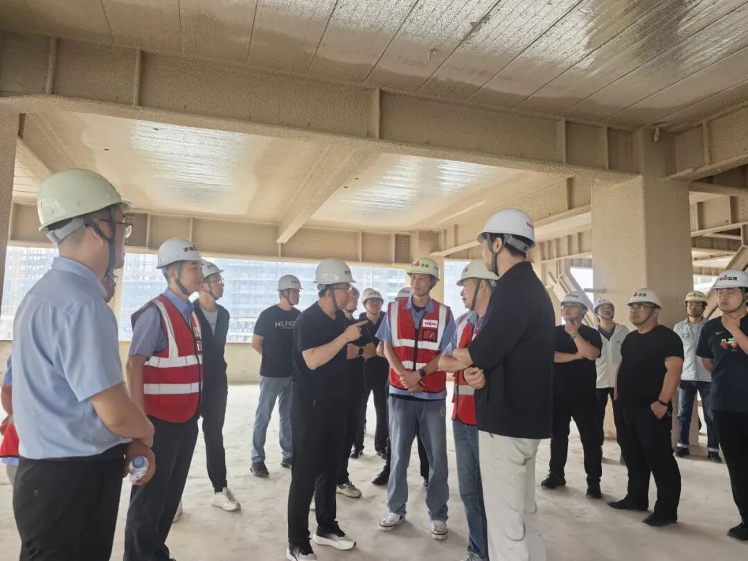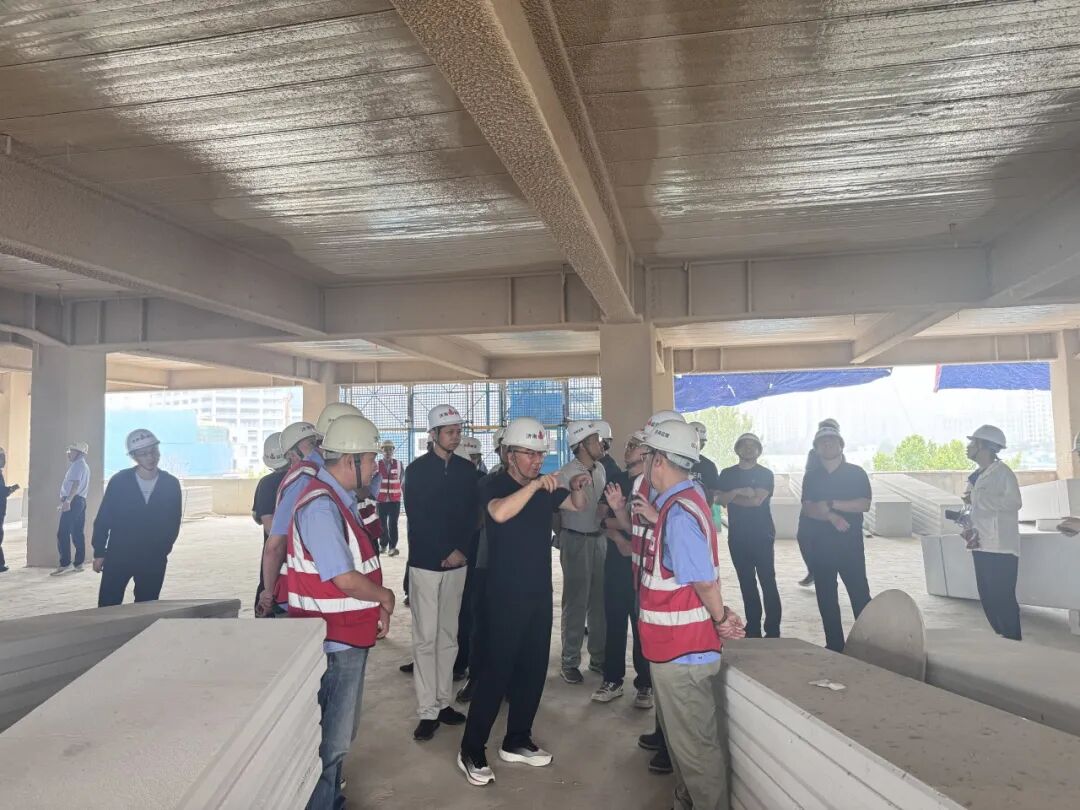 隨后,在總監(jiān)的帶領(lǐng)下,全體人員觀摩了項目現(xiàn)場。由總監(jiān)、各位監(jiān)理工程師向大家講解該項目鋼結(jié)構(gòu)施工過程和控制要點,大家針對本項目的鋼結(jié)構(gòu)柱芯混凝土頂升法澆筑施工工藝展開熱烈的討論。